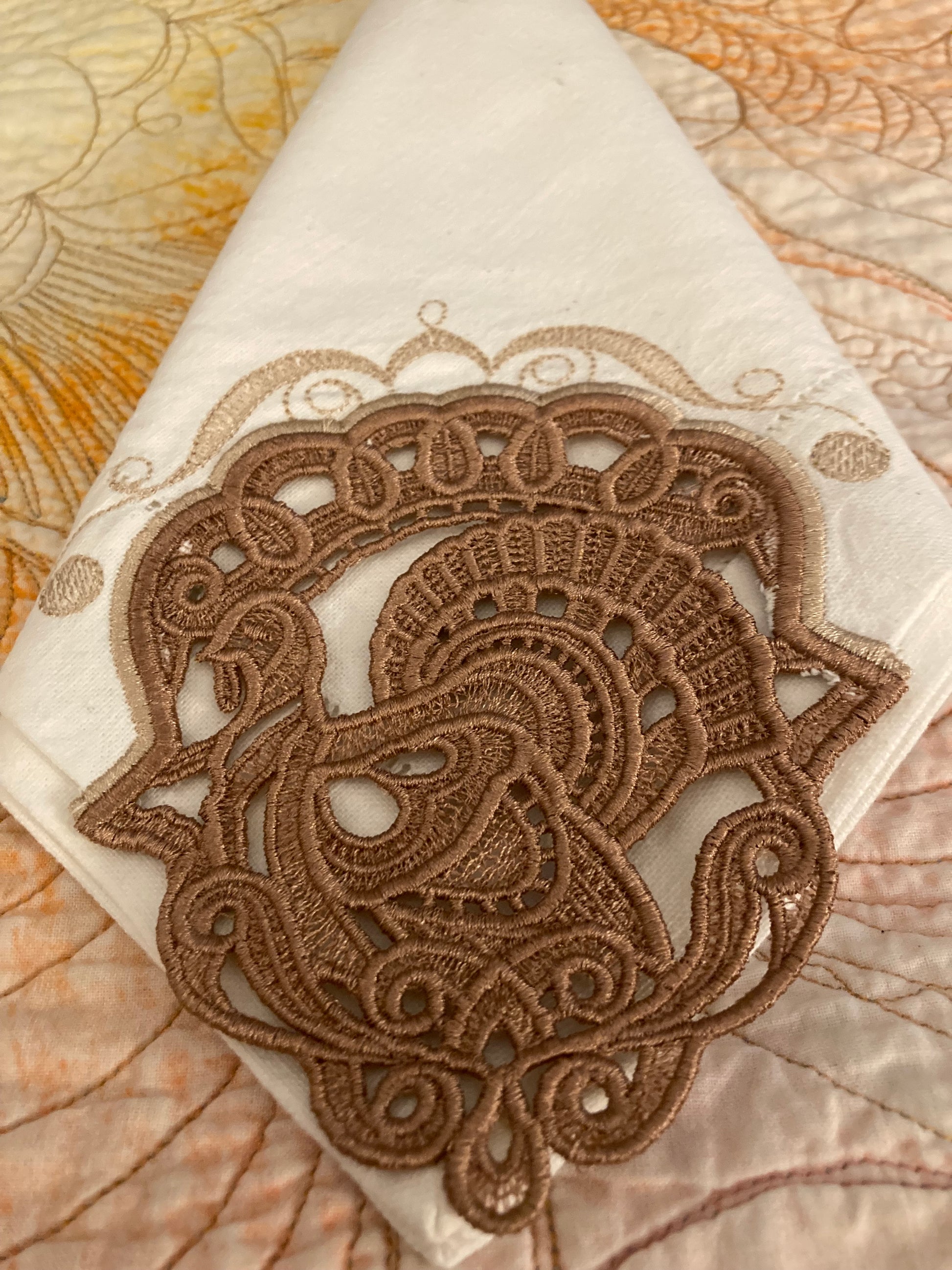 Esta servilleta de lino de 20x20 pulg es una pieza sofisticada para decorar su mesa en Thanksgiving. Con encajes bordados en las esquinas y un promedio de 50,000 puntadas realizadas con hilos Madeira en máquinas Melco, ofrece un acabado delicado y elegante que realza cualquier ocasión especial. Ideal para aportar un toque de distinción y buen gusto a sus celebraciones.